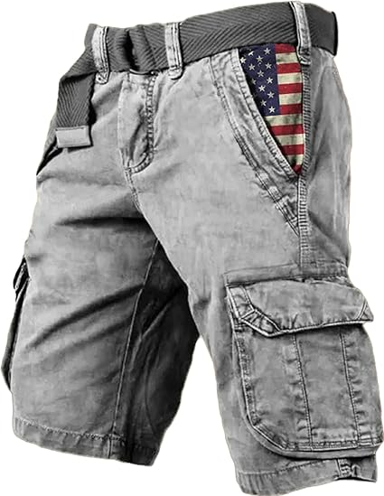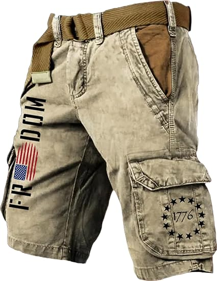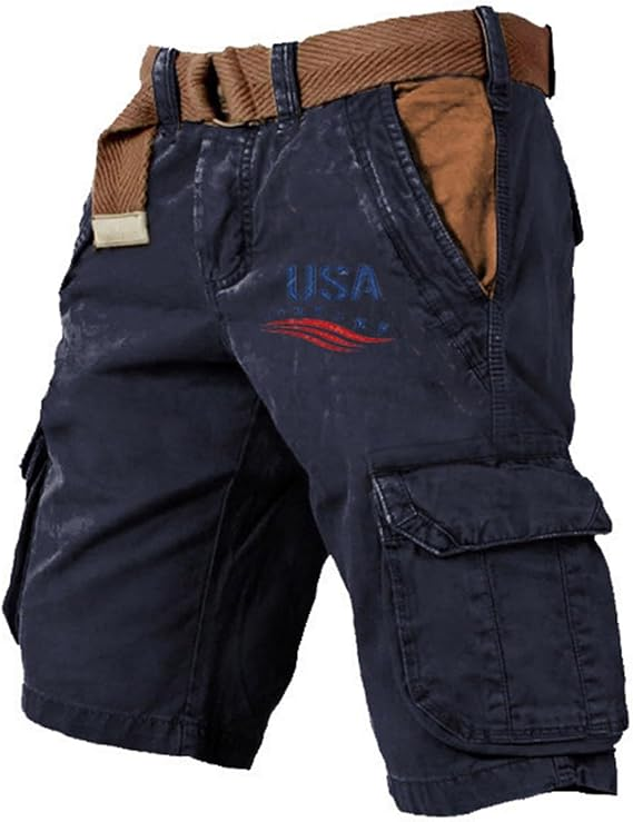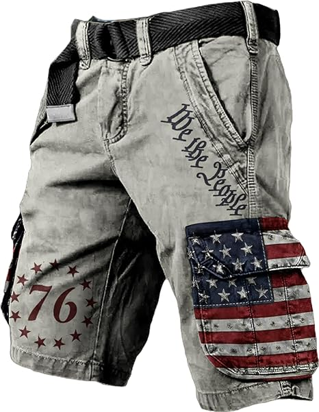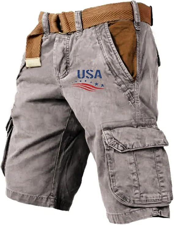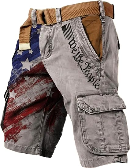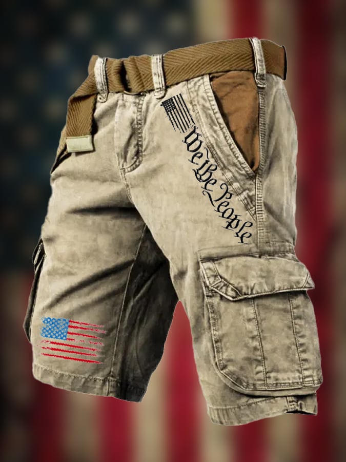 Men's Vintage Flag Independence Day Multi-Pocket Print Cargo Shorts (Belt Included)