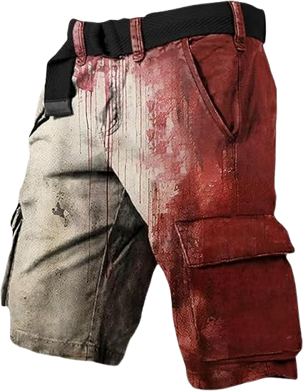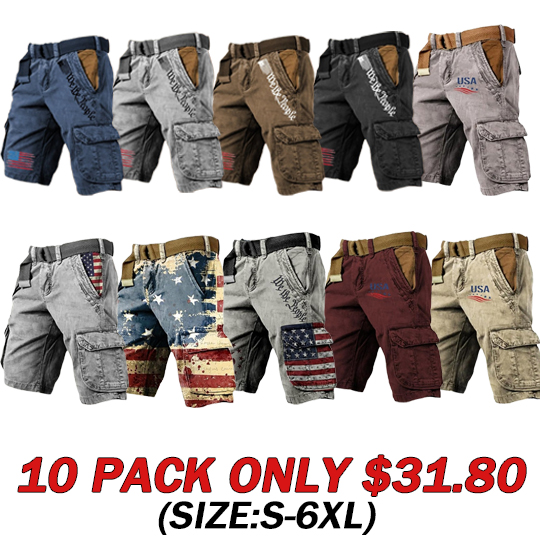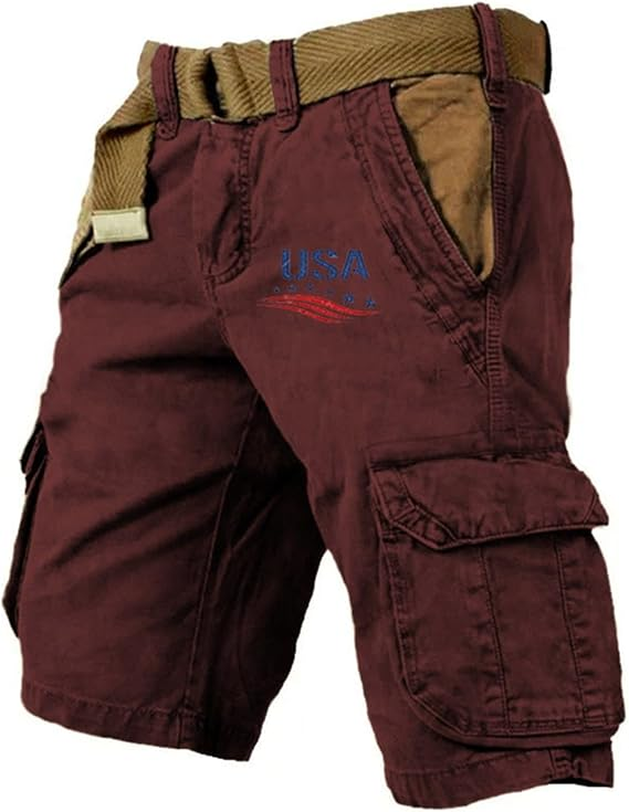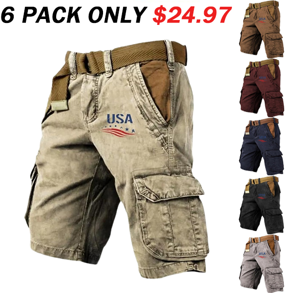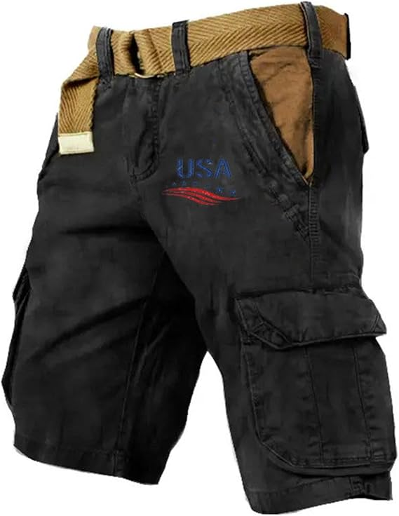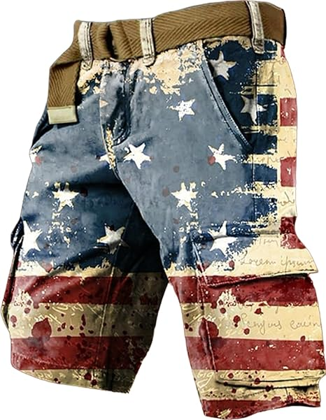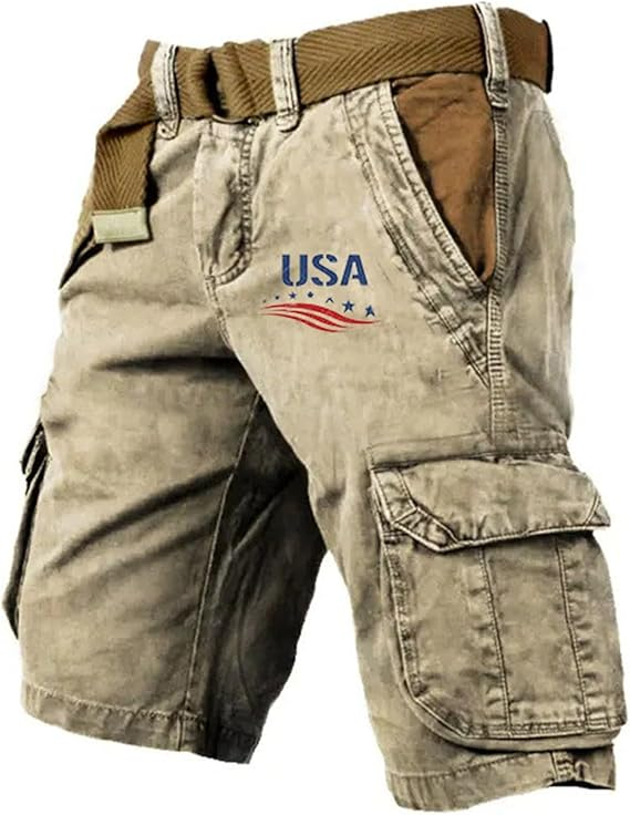 • Men's Vintage Flag Independence Day Multi-Pocket Print Cargo Shorts (Belt Included)