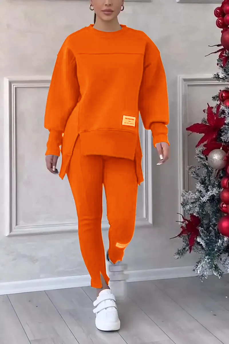 Featuring a simple yet fashionable solid color sweatshirt with a trendy round neck and stylish slit hem detail, paired with figure-flattering leggings.