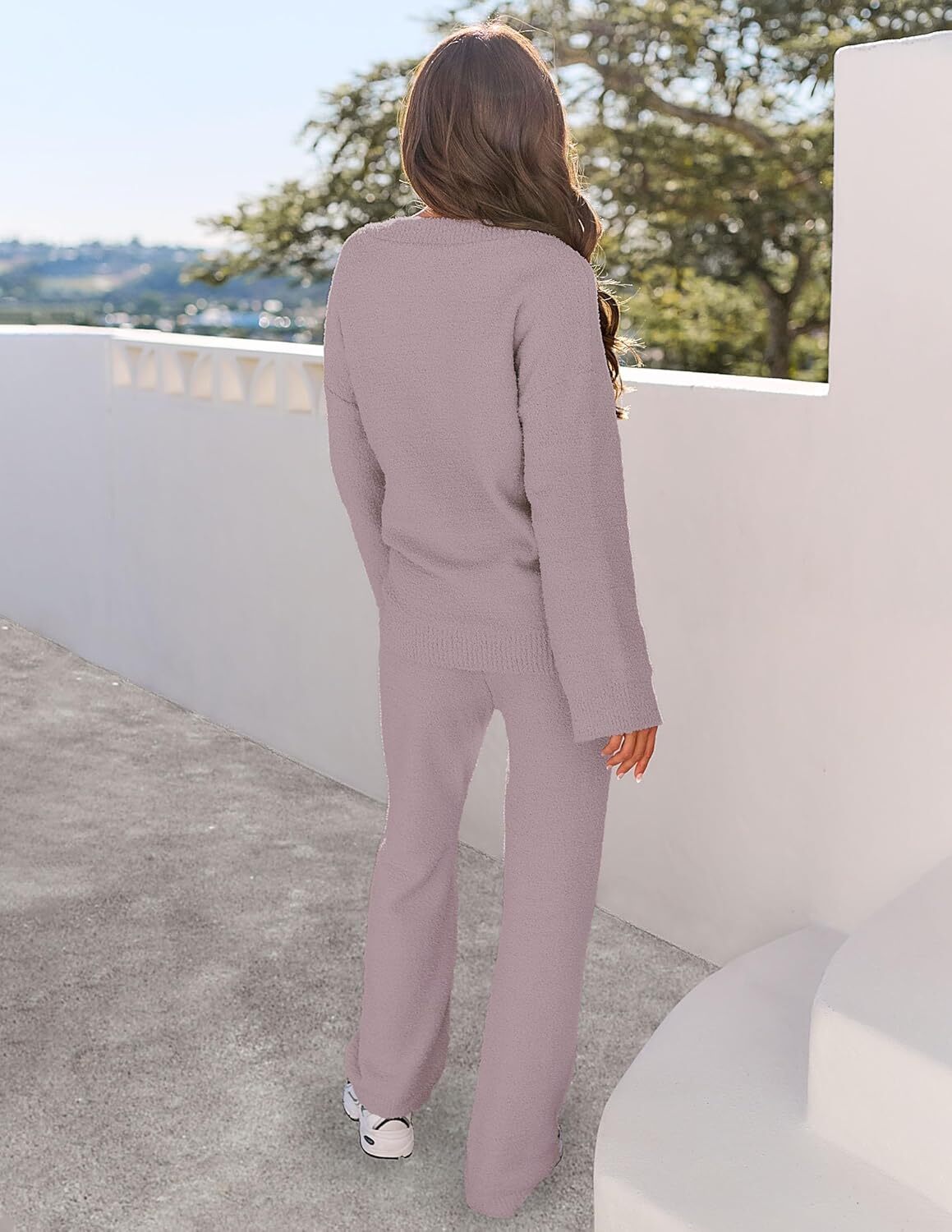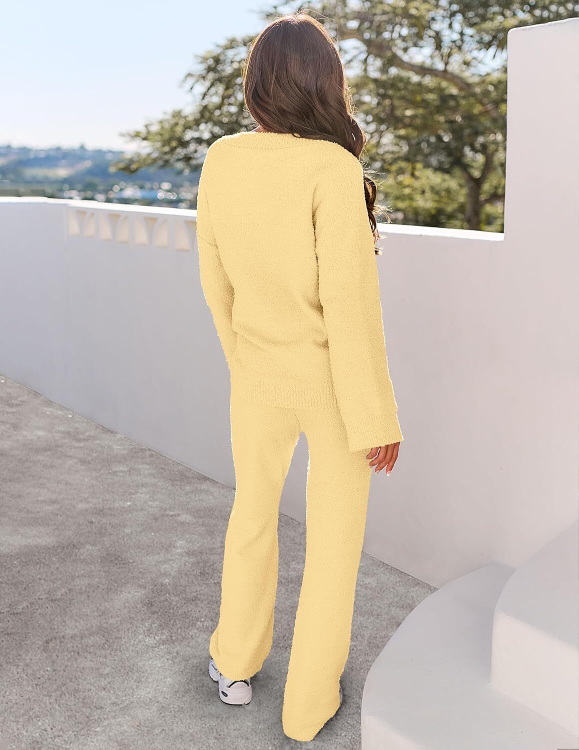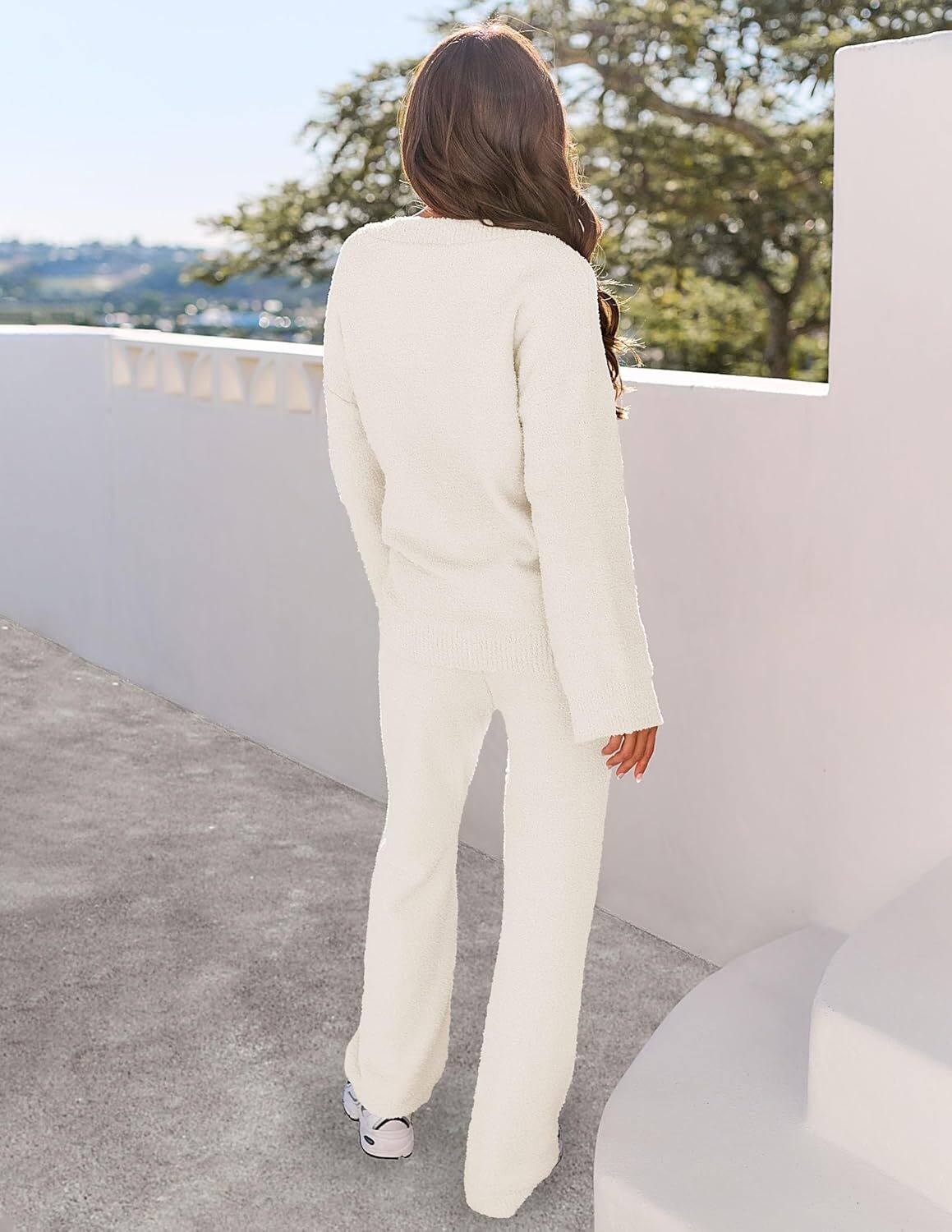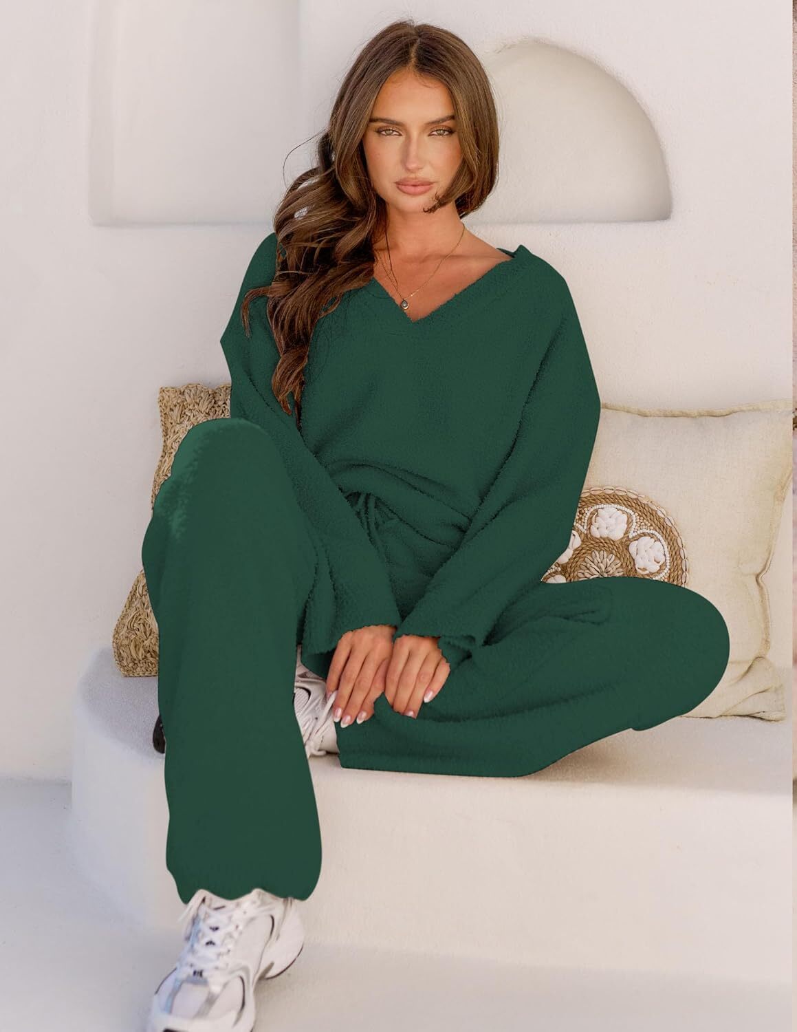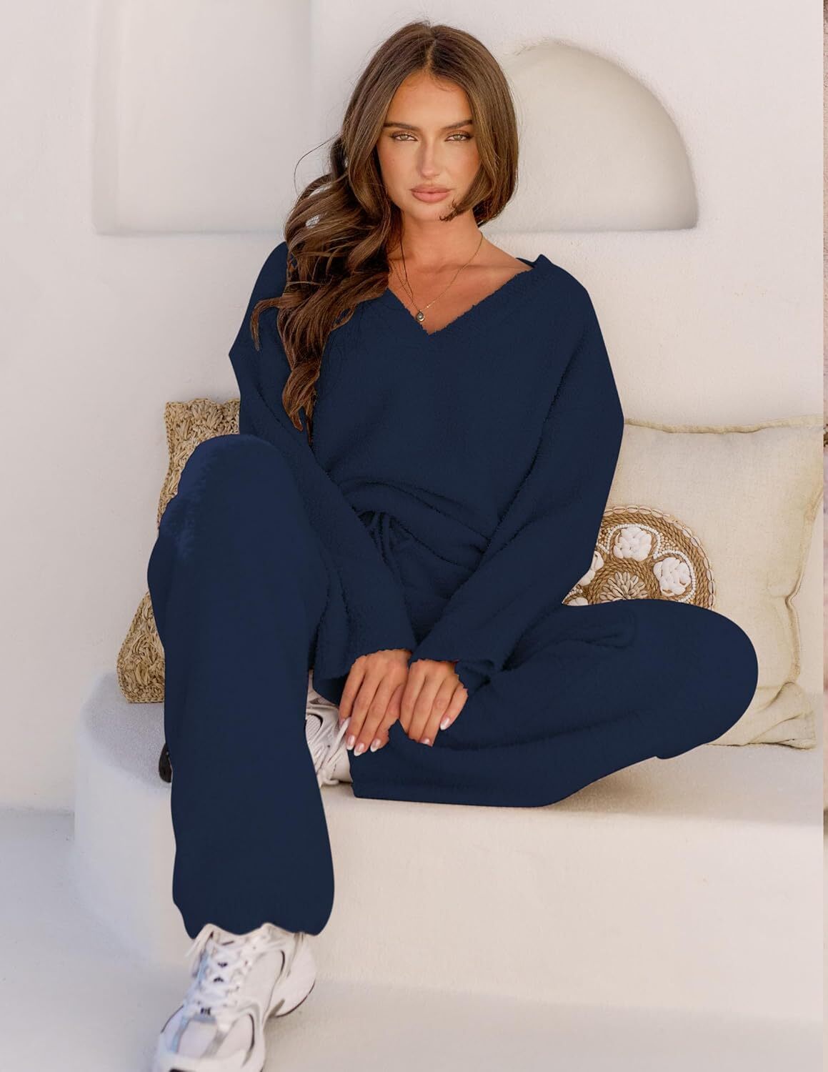 Casual Winter Pajama Set Long Sleeve V Neck Fuzzy Fleece Knitted Pj Sweater Sets