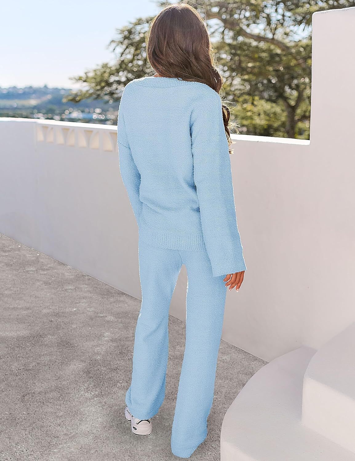 Trendy Fall Long Sleeve V Neck Knit Pullover Sweater Top and Wide Leg Pants