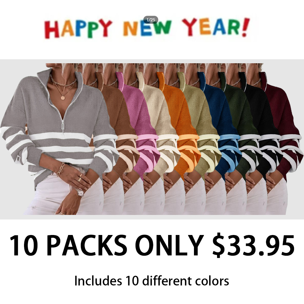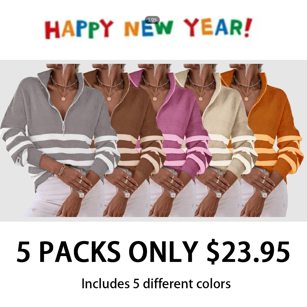 2025 Casual Long Sleeve Zipper Striped Pullover V Neck Ribbed Knitted Autumn and Winter Casual Pullover