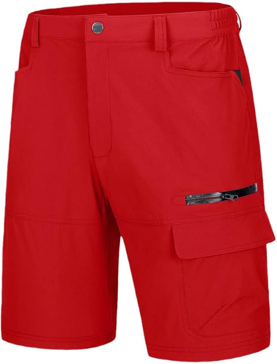 waterproofWaterproof: The Hiking Shorts are made ofwaterproof material, effectively repels stains and liquids5 Pockets: This men's quick dry short features 2 handpockets, 1 waterproof zipper pocket, 1 large cargo pocketat left thigh, 1 rear zipper pockets for the ultimateconvenience and efficiencyDesign: Men's cargo shorts features a partial elasticwaist, button closure with zip fly. Elastic waist with beltloop offer more flexible for a personalized fit.lts innerlength is 9 inches