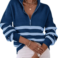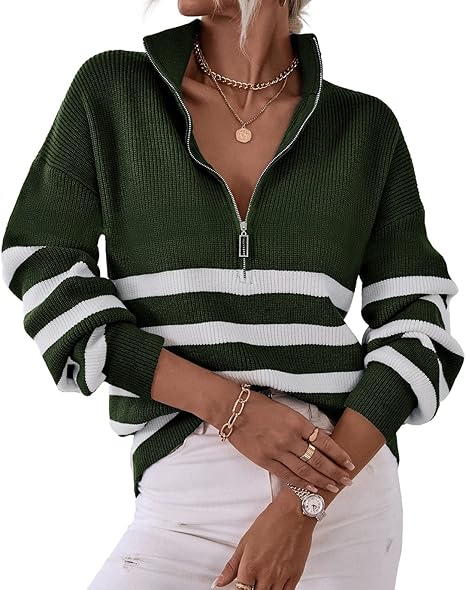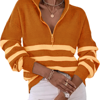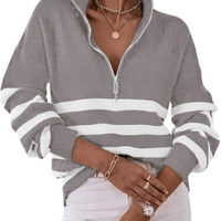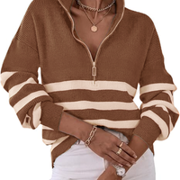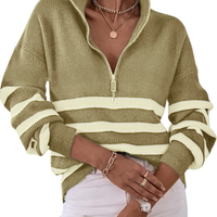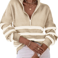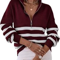 • 2025 Casual Long Sleeve Zipper Striped Pullover V Neck Ribbed Knitted Autumn and Winter Casual Pullover
