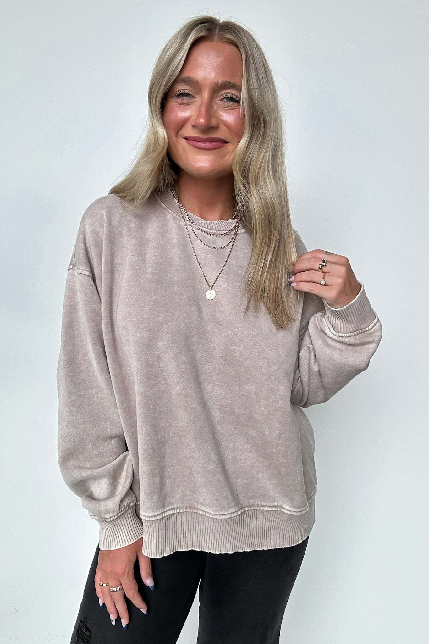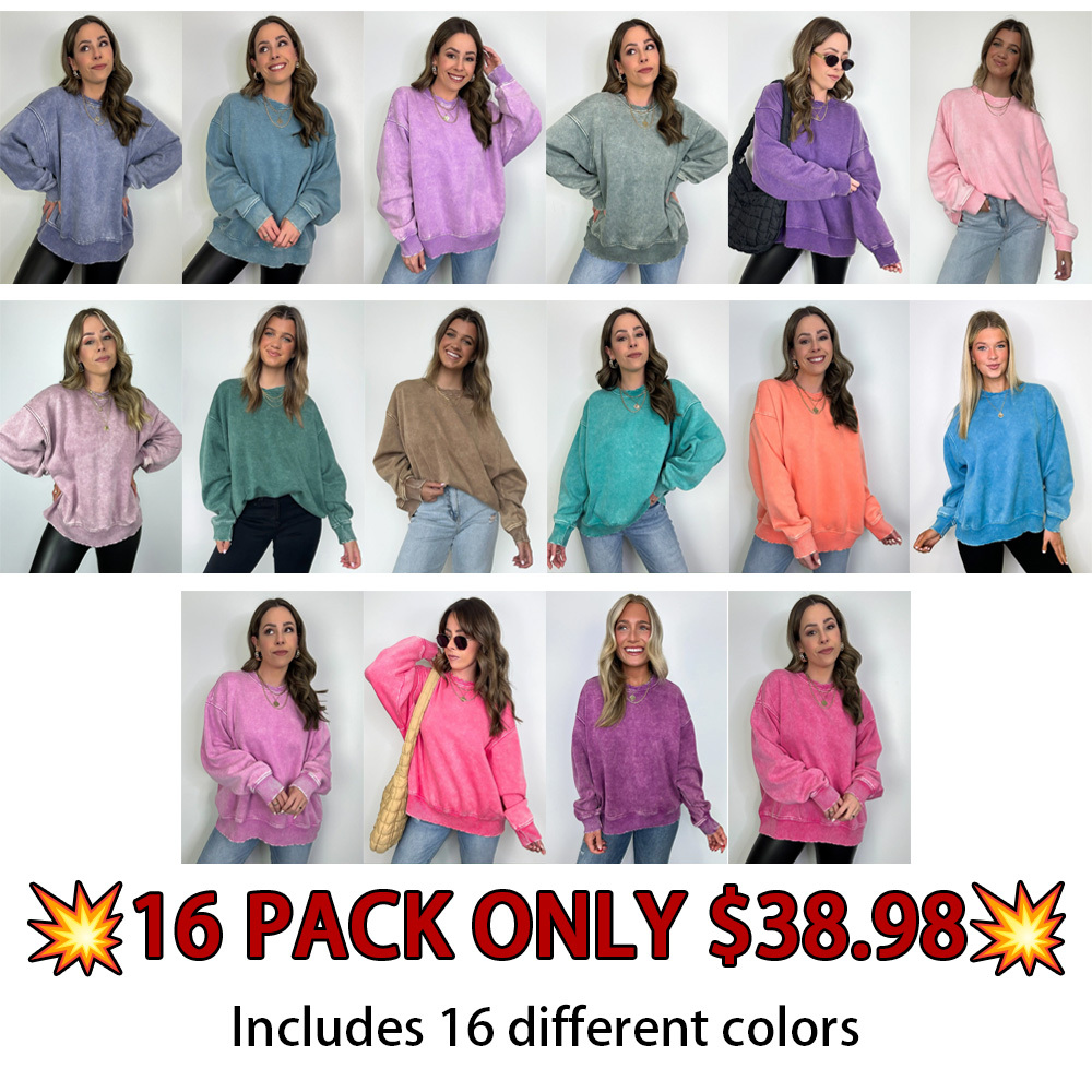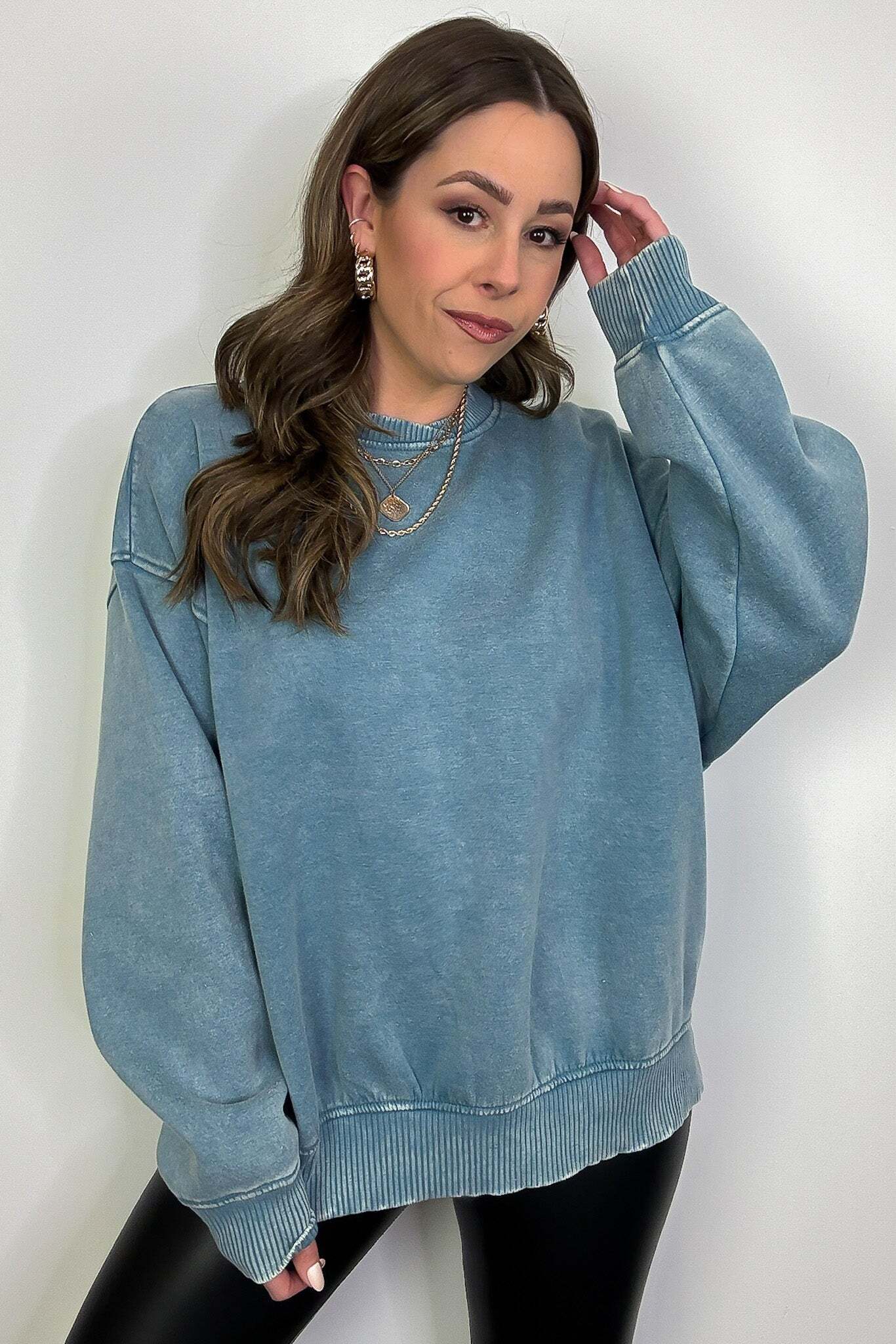 Details: Get cozy in our Acid Wash Oversized Pullover! Made from acid wash fleece, this pullover is perfect for lounging or running errands. The balloon sleeves add a touch of whimsy to this oversized piece. A fun and playful addition to any wardrobe!