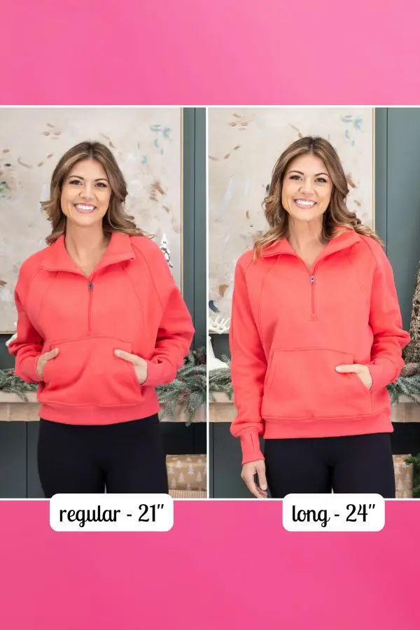 Our #1 Best Selling Pullover Ever!! Over 30,000 Sold! Now in 2 Lengths. Regular ( The Original) 21". and Our New Longer Length (Long ) 24" In Size Medium. Fleece is 50% cotton ( Cotton Rich), and Has a True Fleece Feel! Quarter Zip Funnel Neck Details